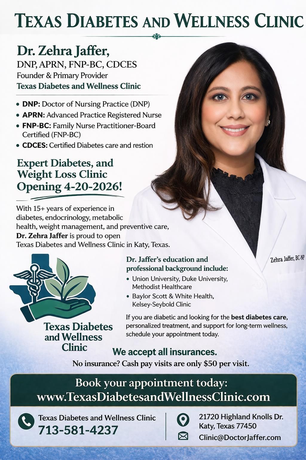 Dr. Zehra Jaffer is proud to open Texas Diabetes and Wellness Clinic in Katy, Texas, with 15+ years of experience in diabetes, endocrinology, metabolic health, weight management, and preventive care.